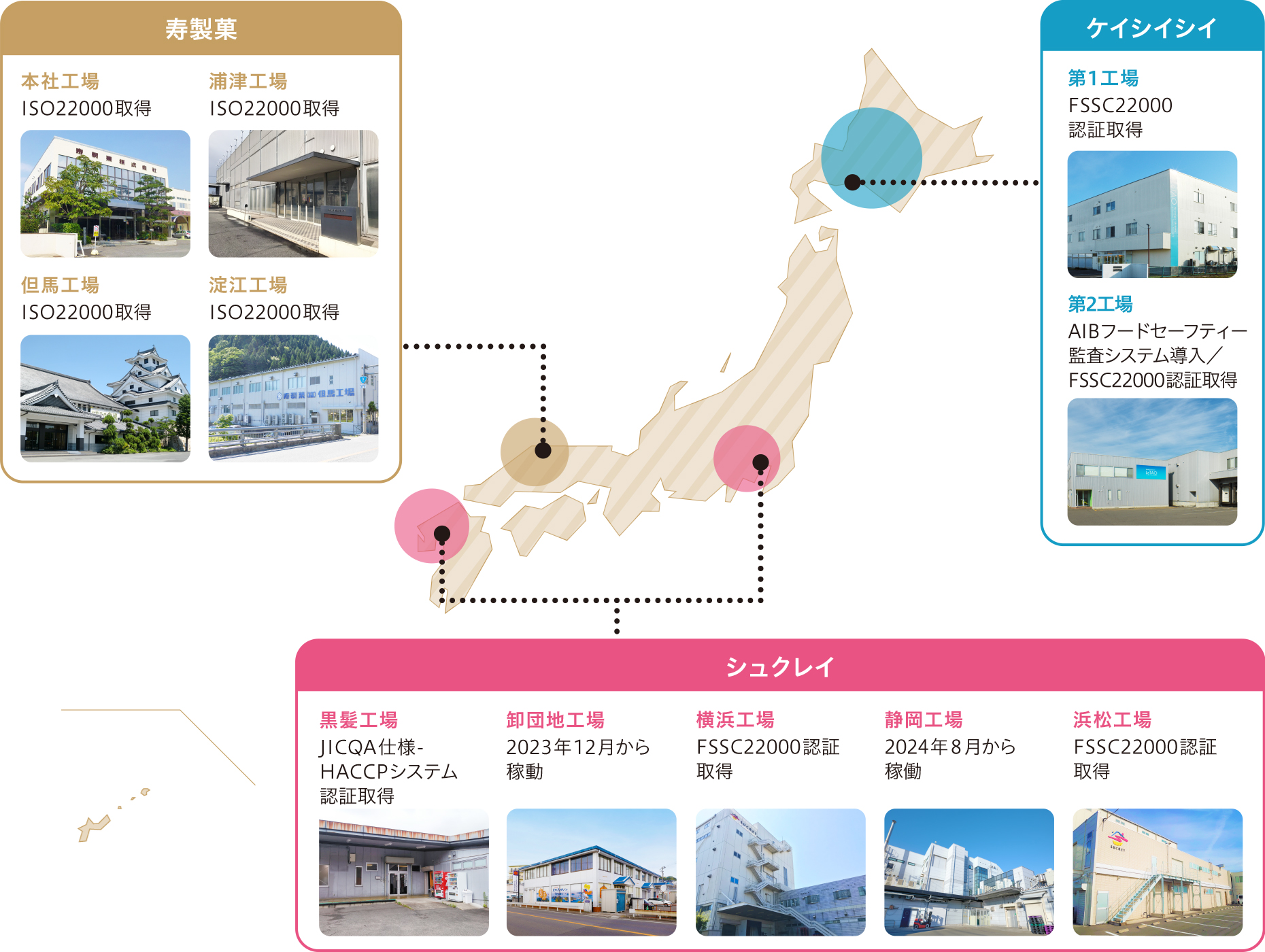 すべての製造工場において食品安全方針を制定し、従業員へ周知し継続的な改善に努め、生産工場の高度化を推進します。また、工場ごとに適切な品質マネジメントシステムの認証を取得し品質管理を徹底しています。